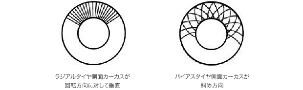 その違いはタイヤ内部のカーカス(コードをゴム被覆した物でタイヤの骨格になる部分)にあります。